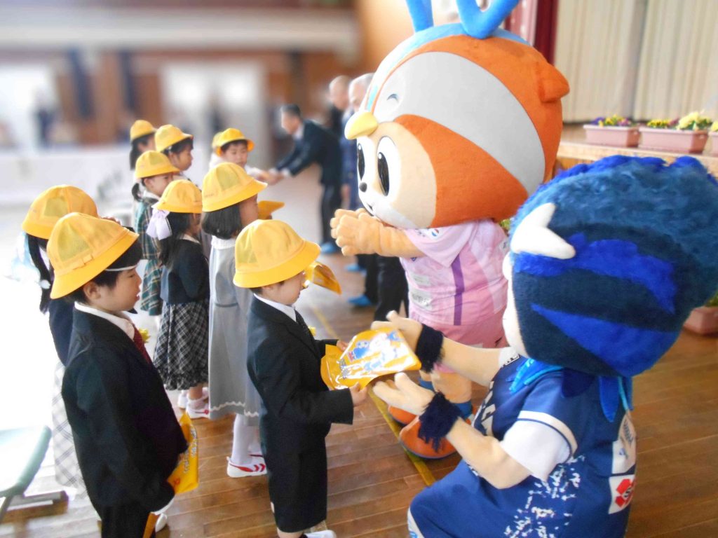 長崎市立朝日小学校において実施した贈呈式にはヴィヴィくんとLUCAも来てくれました。(感謝)